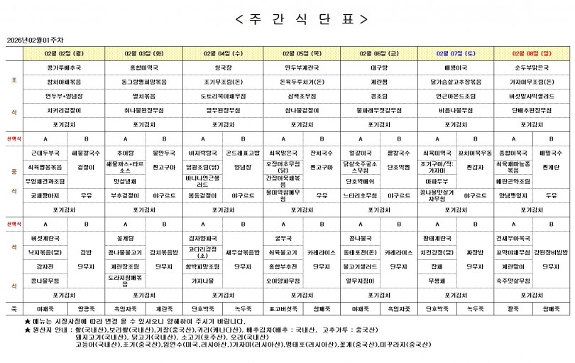 주간 식단표 (2월 1주) 페이지 정보 작성자 최고관리자 작성일26-01-30 14:39 조회56회 댓글0건 이전글 다음글 목록 본문 주간 식단표 (2월 1주) 댓글목록 등록된 댓글이 없습니다. 이전글 다음글 목록