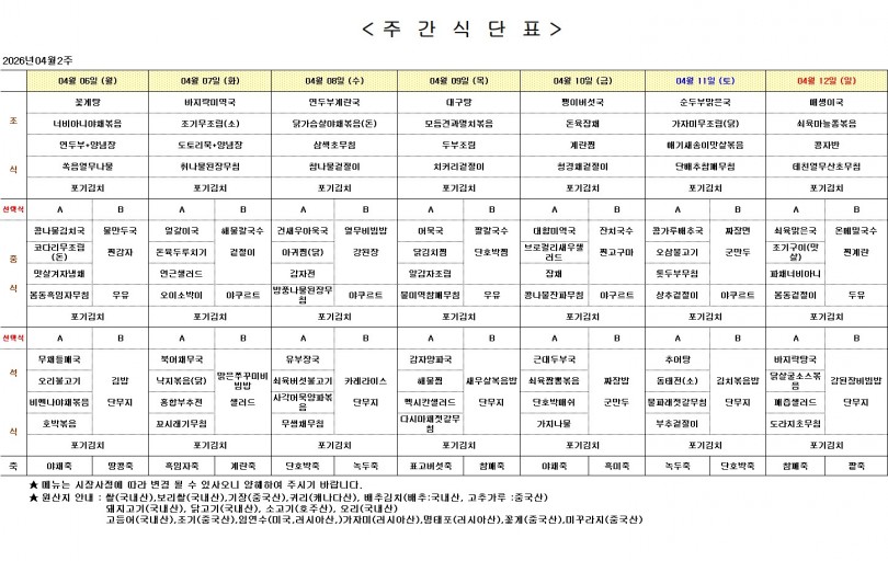 주간 식단표 (4월 2주) 페이지 정보 작성자 최고관리자 작성일26-04-03 14:50 조회152회 댓글0건 다음글 목록 본문 주간 식단표 (4월 2주) 댓글목록 등록된 댓글이 없습니다. 다음글 목록