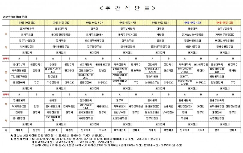 주간 식단표 (4월 1주) 페이지 정보 작성자 최고관리자 작성일26-03-26 09:43 조회8회 댓글0건 다음글 목록 본문 주간 식단표 (4월 1주) 댓글목록 등록된 댓글이 없습니다. 다음글 목록