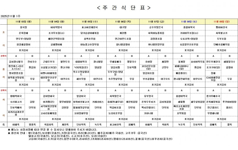 주간 식단표 (11월 1주) 페이지 정보 작성자 최고관리자 작성일25-10-31 15:50 조회59회 댓글0건 이전글 다음글 목록 본문 주간 식단표 (11월 1주) 댓글목록 등록된 댓글이 없습니다. 이전글 다음글 목록