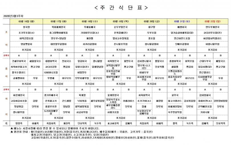 주간 식단표 (3월 3주) 페이지 정보 작성자 최고관리자 작성일26-03-13 14:01 조회78회 댓글0건 이전글 다음글 목록 본문 주간 식단표 (3월 3주) 댓글목록 등록된 댓글이 없습니다. 이전글 다음글 목록