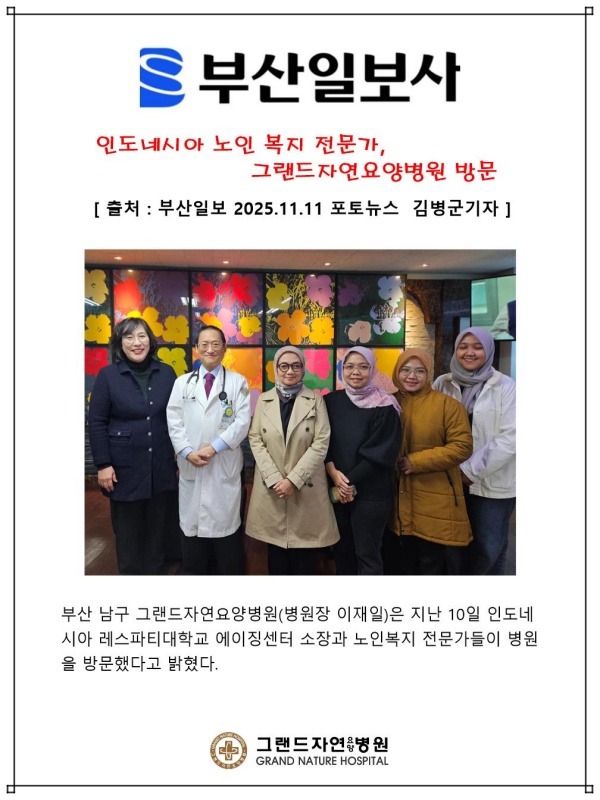 [부산일보] 인도네시아 노인 복지 전문가, 그랜드자연요양병원 방문 페이지 정보 작성자 최고관리자 작성일25-11-17 11:55 조회523회 댓글0건 다음글 목록 본문 [ 출처 : 부산일보 2025. 11.11 포토뉴스 김병군 기자 ] 댓글목록 등록된 댓글이 없습니다. 다음글 목록