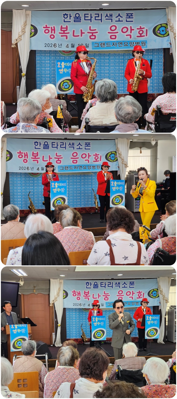 그랜드자연요양병원은 4월 16일 한울타리 색소폰의 <행복 나눔>공연으로 작은 음악회를 열었다. 이날 공연은 <용두산 엘레지>, <추억의 소야곡> 등의 색소폰 연주와 <새 타령>, <창부 타령> 등의 옛가요, 민요로 어르신들과 함께 즐거운 시간을 마련했다.