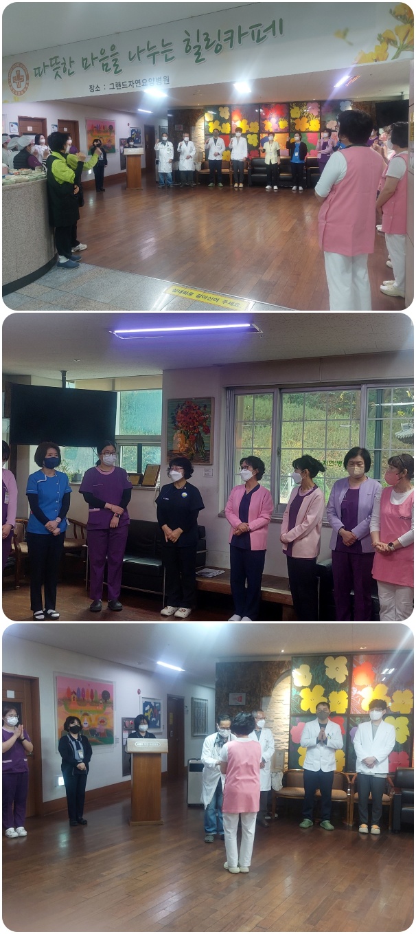 12월 2일 그랜드자연요양병원은 1층 로비에서 전직원들이 참석한 가운데 그랜드자연 12월 월례회를 가졌다. 이날 이재일 병원장은 한해를 잘 마무리하는 12월이 될 것을 강조하며 내년을 준비하는 한달을 만들자고 인사에 대신하였다. 이어서 신입직원의 인사와 공로상 전달이 이어졌고 한해의 마지막 달 12월의 시작을 준비하는 마음으로 "그랜드 그랜드 힘!"의 구호와 함께 12월 월례회를 마쳤다.